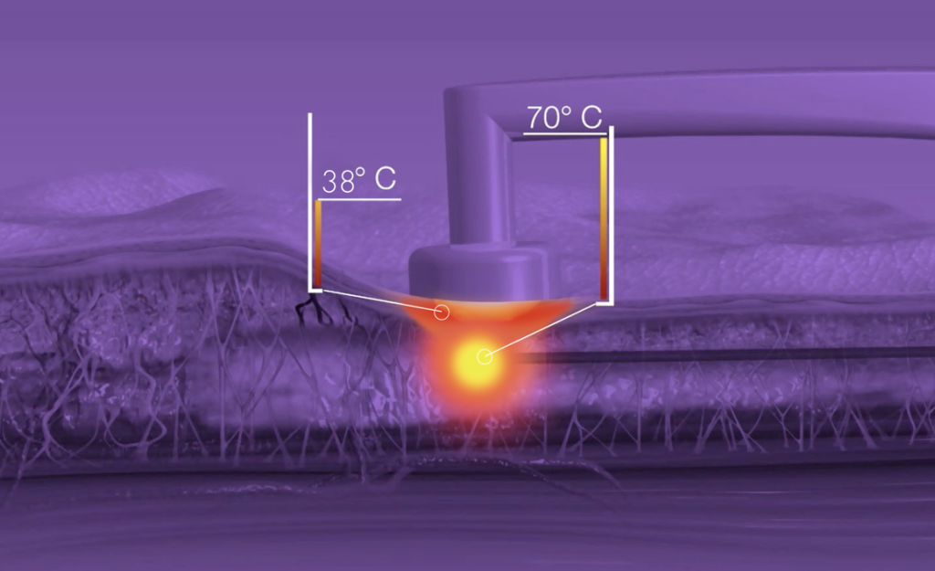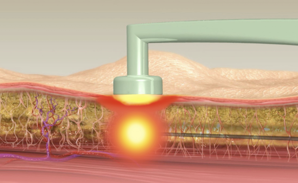 高周波(RF)の熱で脂肪を柔らかくし、自然に代謝されるように促します。気になる二の腕やお腹、太ももに効果絶大!脂肪吸引と併用するとキレイに脂肪が取れますし、併用しなくても全体量が減って引き締まります