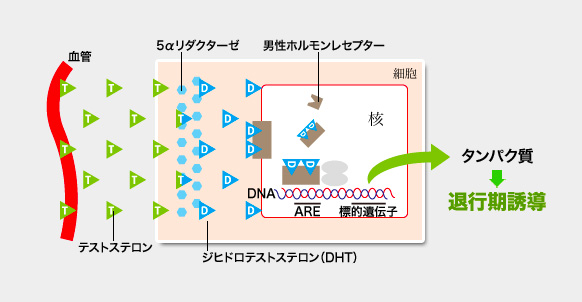 男性ホルモンのテストステロンが5αリダクターゼという酵素と結びつくと薄毛ホルモンであるDHT(ジヒドロテストステロン)を作り出します。
