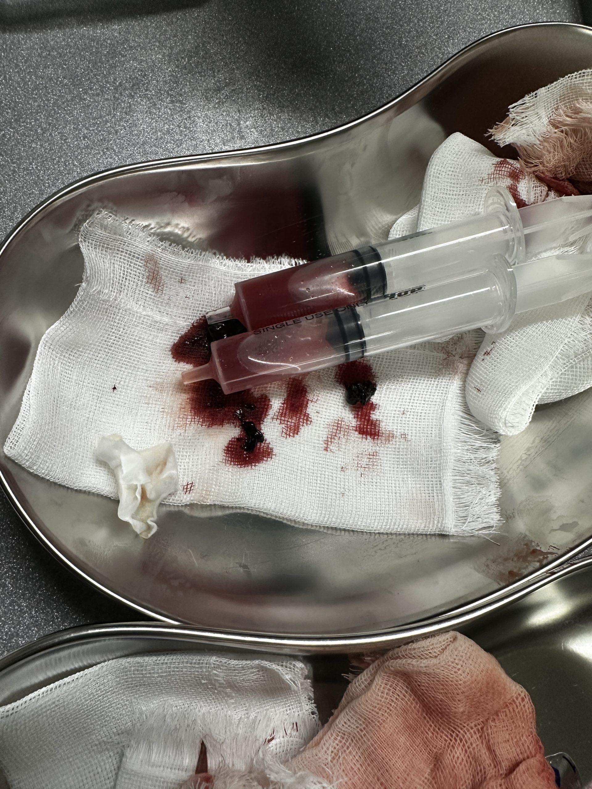 範囲を触診で診ながら、局所麻酔注射して、メスで3cmほどカットすると血腫、血の塊が出てきました。