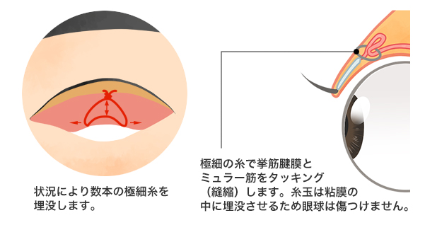 切らない眼瞼下垂: 緩んだ筋肉を糸でタッキング(補強)して「土台」から引き上げる。