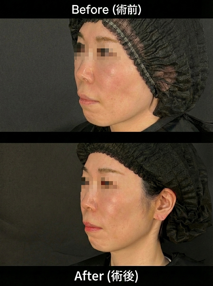 Beforeでは頬のボリュームが下がり、口元(マリオネットライン付近)に重みが溜まっていましたが、Afterでは頬のトップ位置(一番高い部分)がグッと上に移動しています。