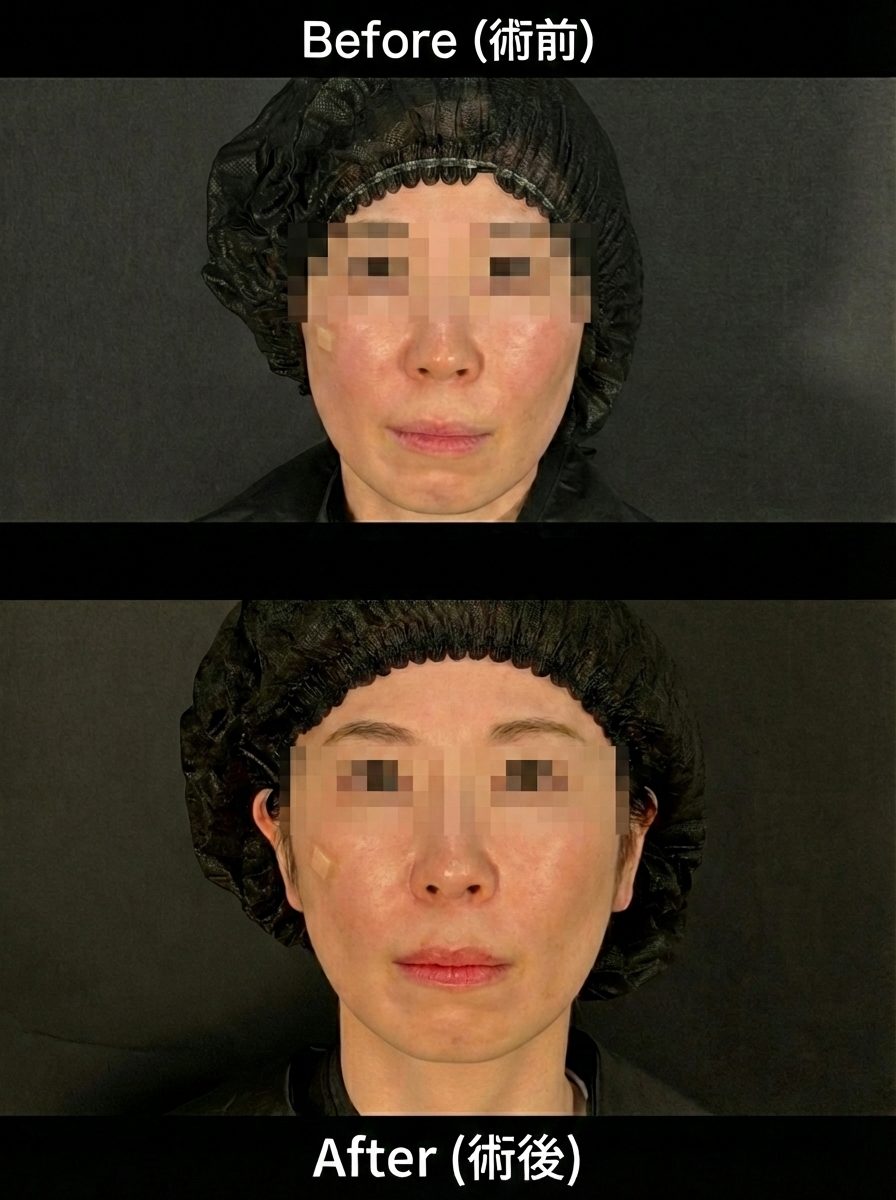 【正面】 Beforeでは重力によって下垂し、やや四角く見えていた輪郭が、Afterでは顎先に向かってシャープに引き締まり、理想的な「Vライン(卵型)」へと変化しています。顔の面積が物理的に小さくなったような小顔効果が顕著です。