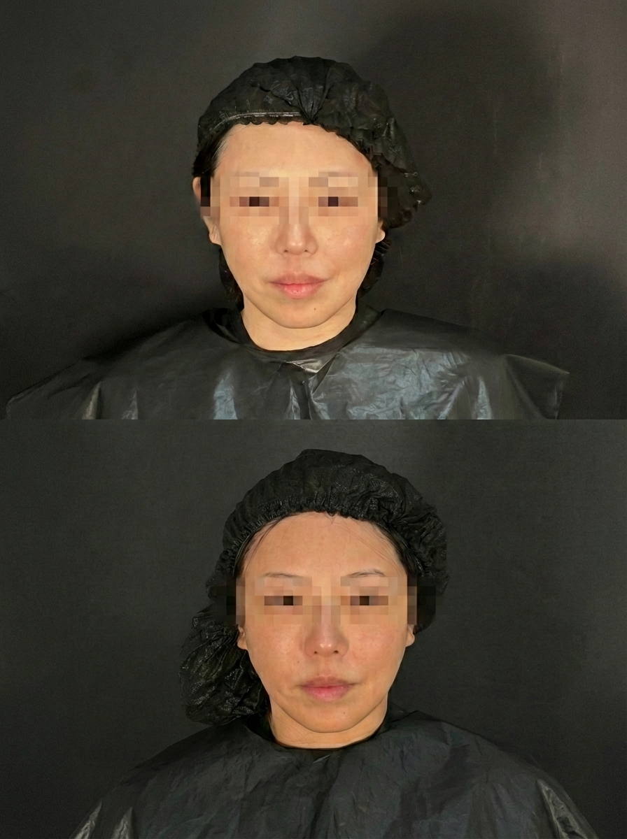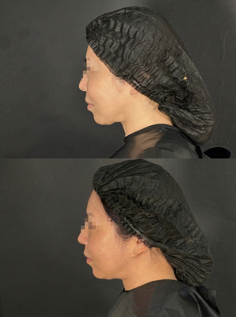 術前は顎下から首にかけてのラインが少し曖昧でしたが、術後は顎先から耳下にかけてのライン(フェイスライン)がくっきりと浮かび上がっています。 -