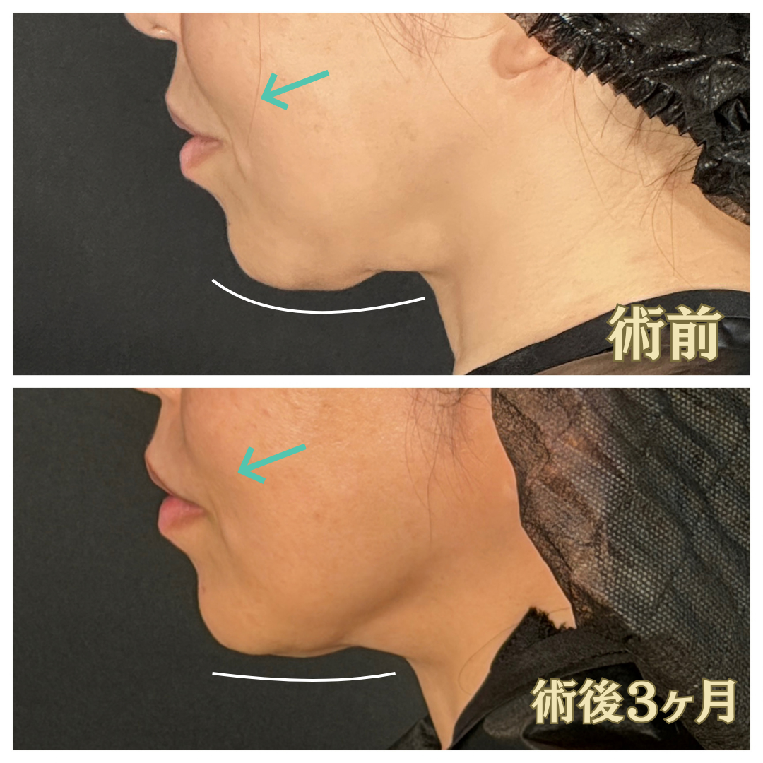 ご覧ください‼️👀緑の矢印のところ、 ほうれい線やマリオネットラインが、術前では濃く、両者が繋がりそうですよね。術後3ヶ月ではシワは薄く、 術前は、ほうれい線とマリオネットラインが繋がりそうになっていたのが… 術後3ヶ月目は、見事に分かれていっているのが分かりますよね‼️😲💡