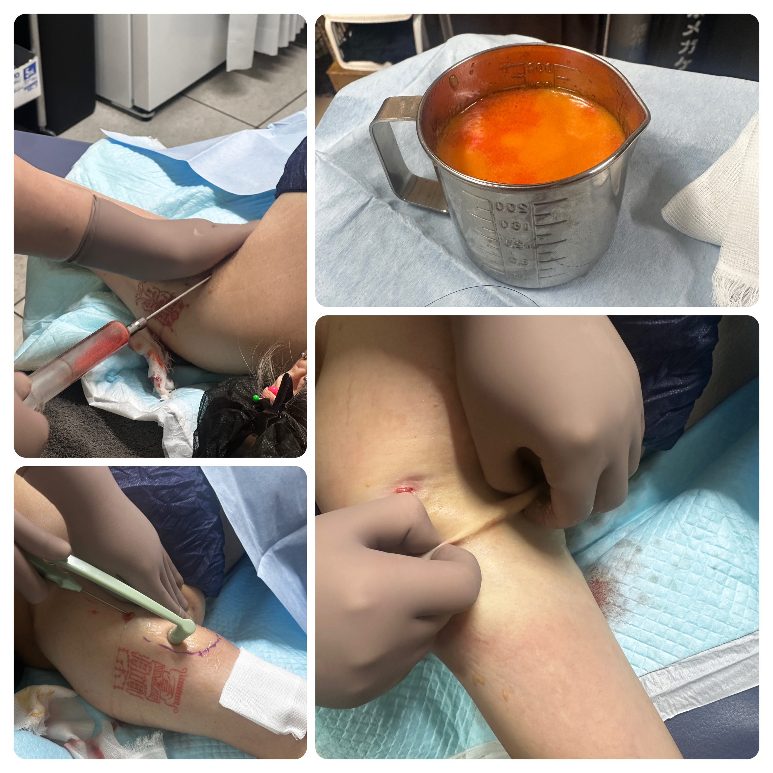 いよいよ脂肪を取っていきます。 当院では、「シリンジ法」という、組織を大きく傷つけない優しい方法を採用しています。