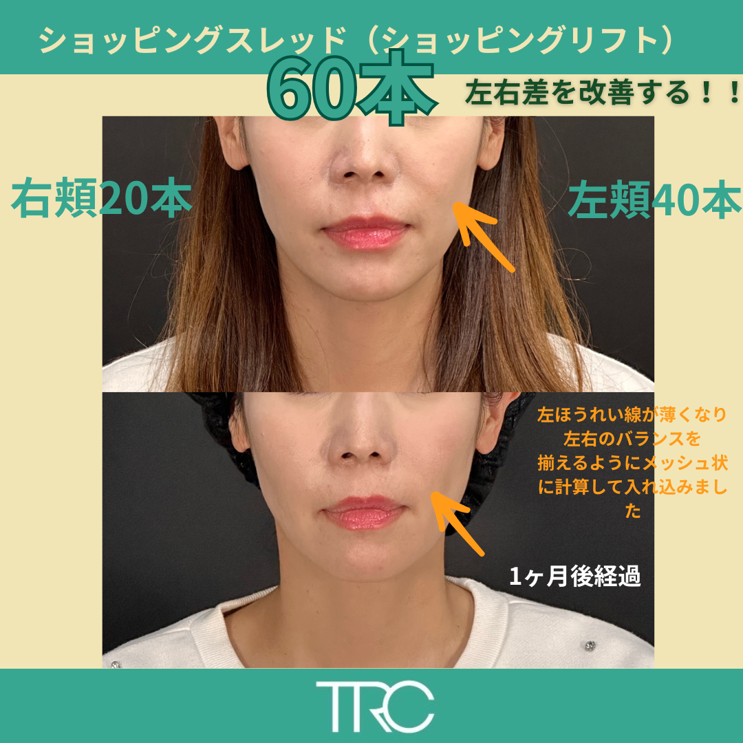 例えば、この症例では左頬が垂れてほうれい線が目立っているのがお悩みだったので、60本を左頬40本、右頬20本と左頬をより上方に固定するように本数を多く入れました