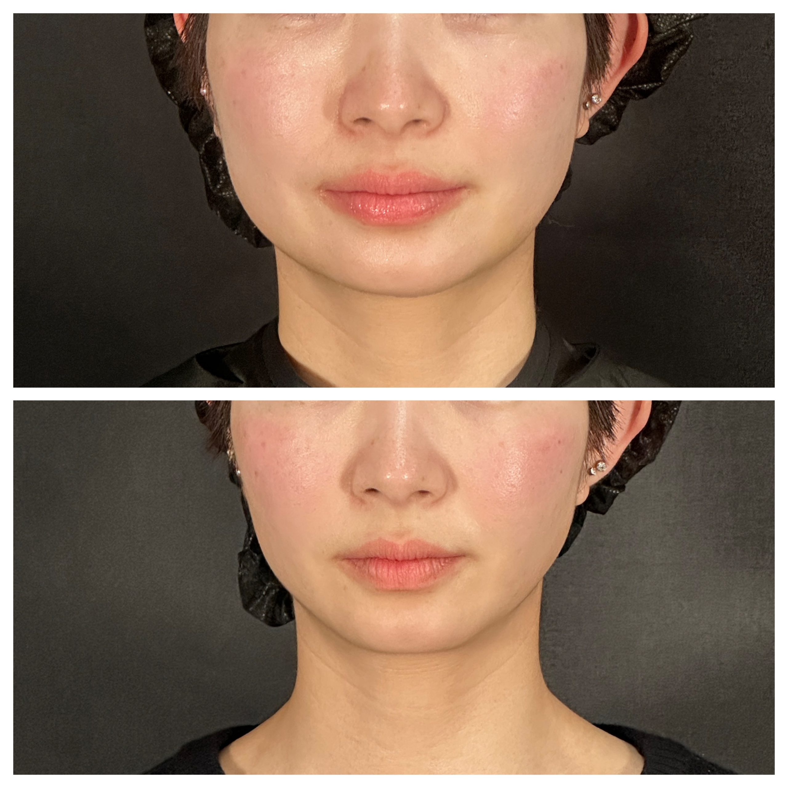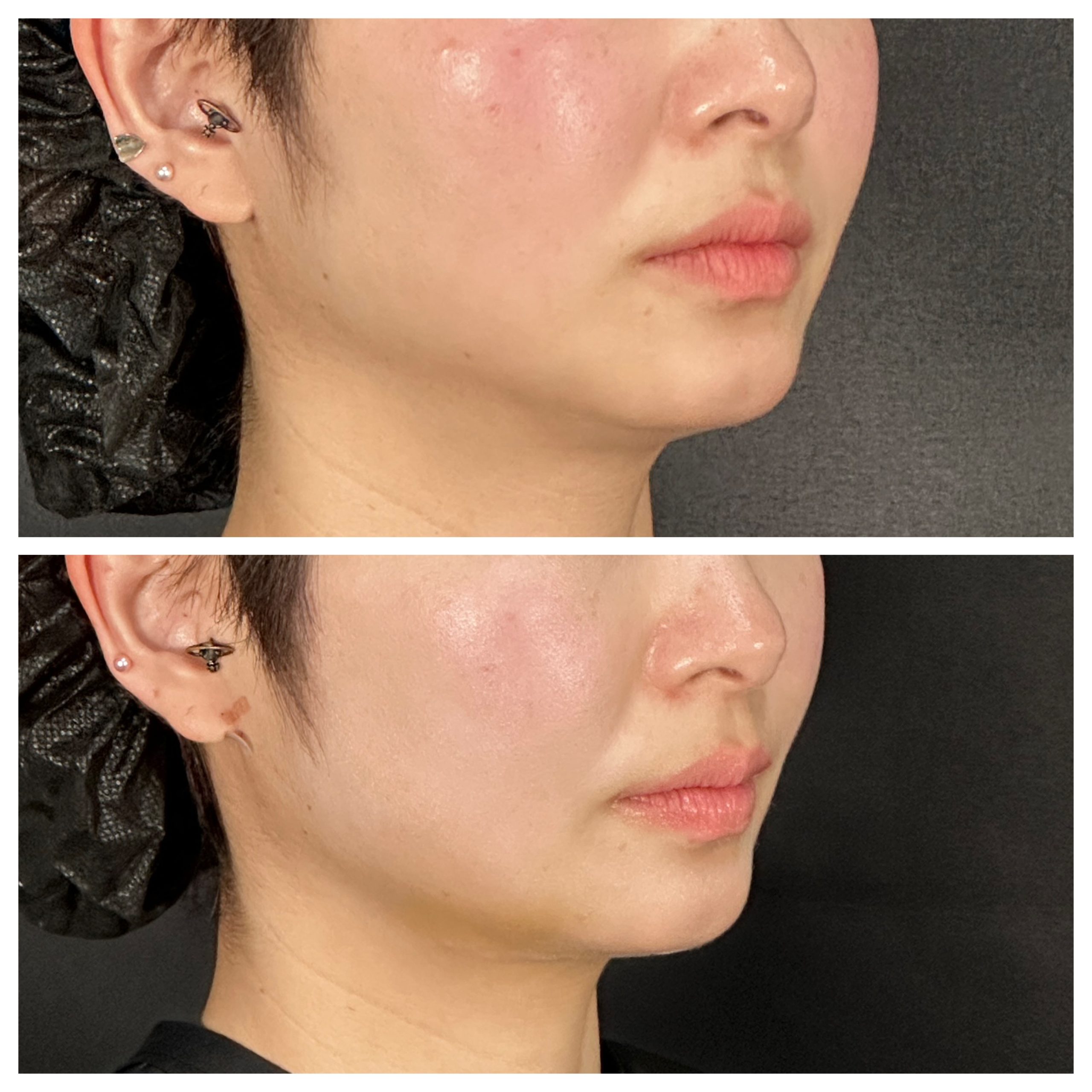 ほうれい線とマリオネットラインが直後から薄くなったのがお分かりでしょうか? 打ち方をより工夫を入れました。ナゾビアルファットとジョールファットを4m m、3m m、2m mと細かい層に少し縦方向に引くように打ち、一つの場所を45度ずつ角度を変えて打つようにしたところRF波の熱の入り方が均等に引き締まるように入るようになりました。